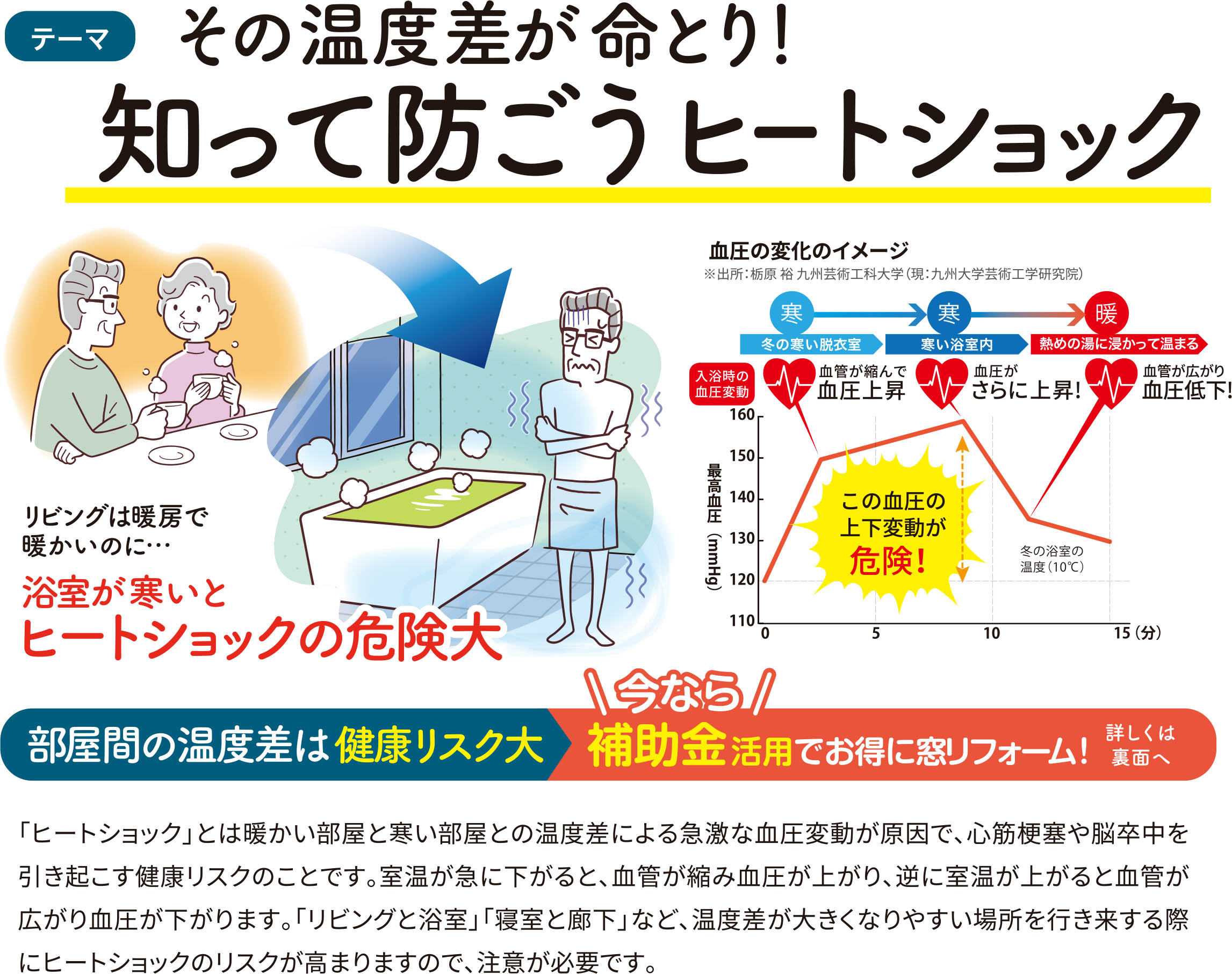 「ヒートショック」とは暖かい部屋と寒い部屋との温度差による急激な血圧変動が原因で、心筋梗塞や脳卒中を引き起こす健康リスクのことです。