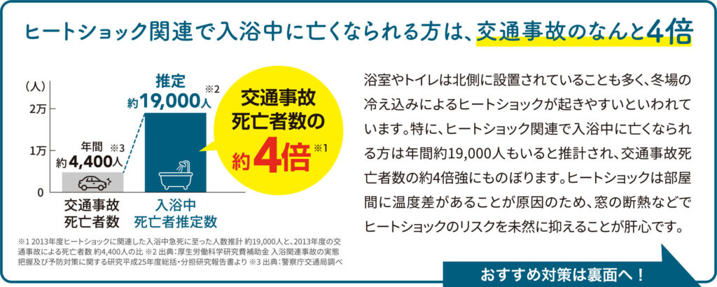 特に、ヒートショック関連で入浴中に亡くなられる方は年間約19,000人もいると推計され、交通事故死亡者数の約4倍強にものぼります。