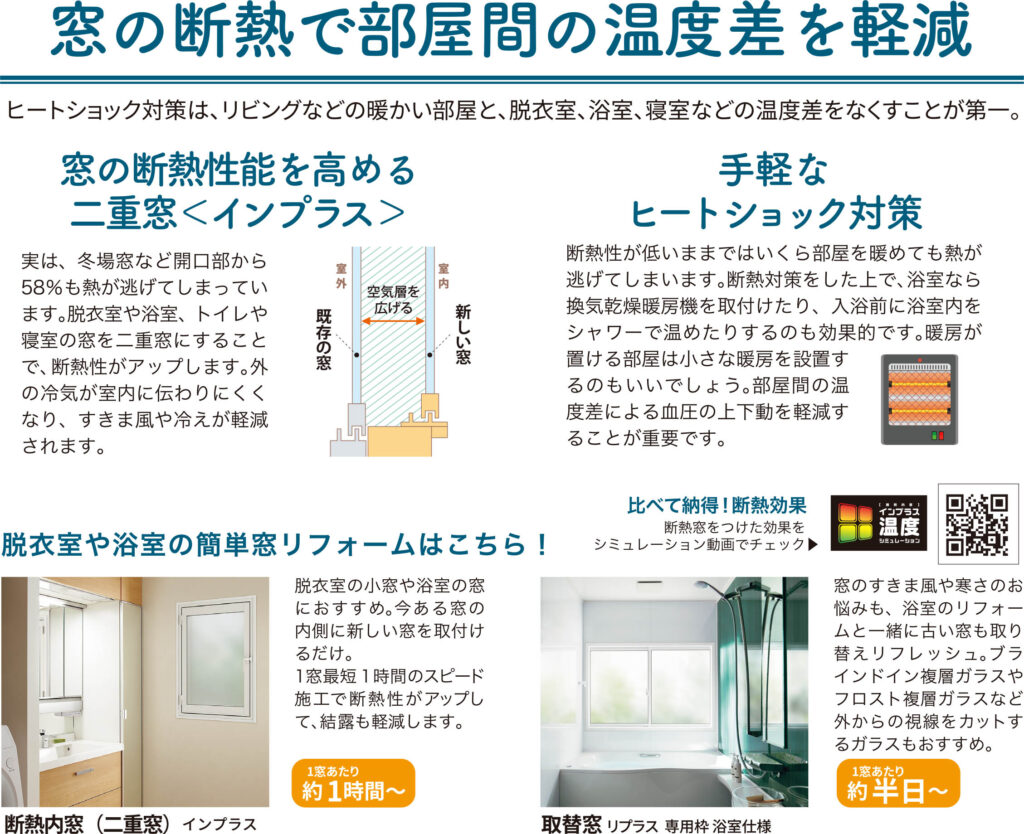 二重窓<インプラス>で窓の断熱性能を高めることが、温度差を解消する最も効果的な方法です。
