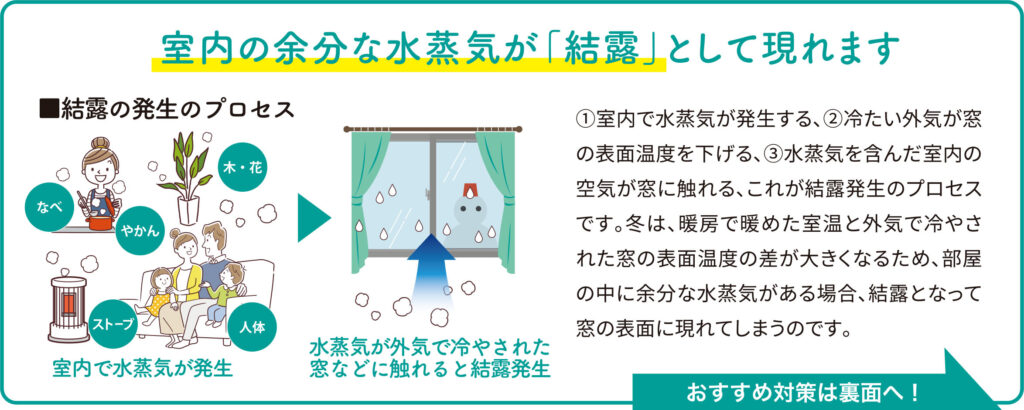 結露の発生原因は、室内の余分な水蒸気。冬は暖房で暖めた室内と、外気で冷やされた窓の表面温度の差が大きくなるため、部屋の中に余分な水蒸気がある場合、結露となって窓の表面にあらわれてしまう のです。