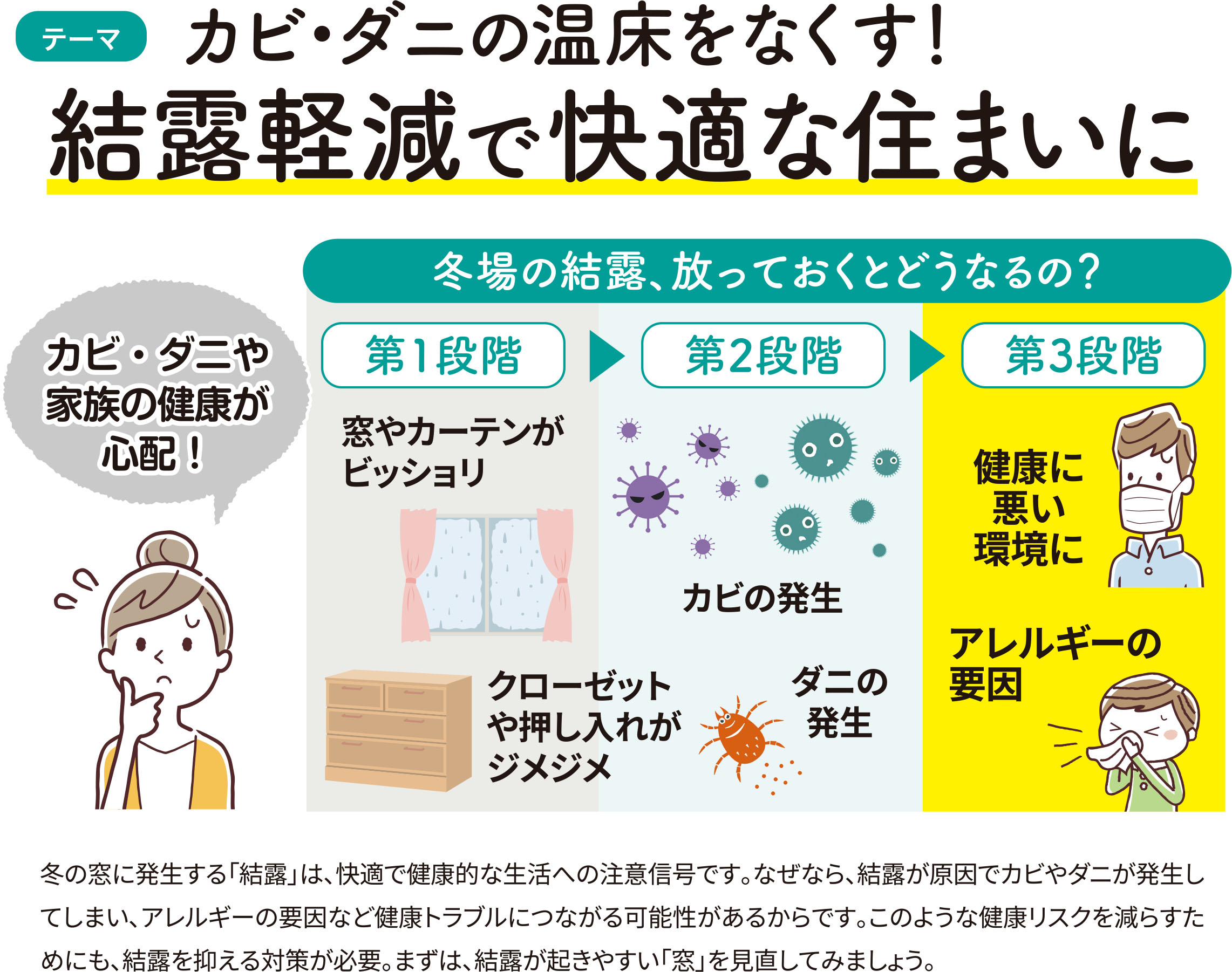 冬の窓に発生する「結露」。そのままにしておくと、結露が原因でカビやダニが発生してしまい、アレルギーなど健康トラブルにつながる可能性があります。