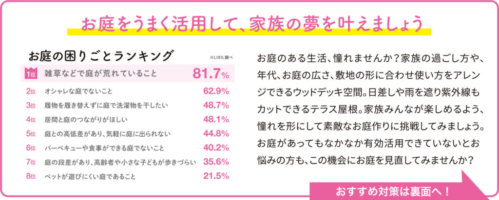 「お庭はあるけれど、草むしりが大変」「外からの視線が気になって、なかなか活用できていない」 そんなお悩みをお持ちではありませんか?